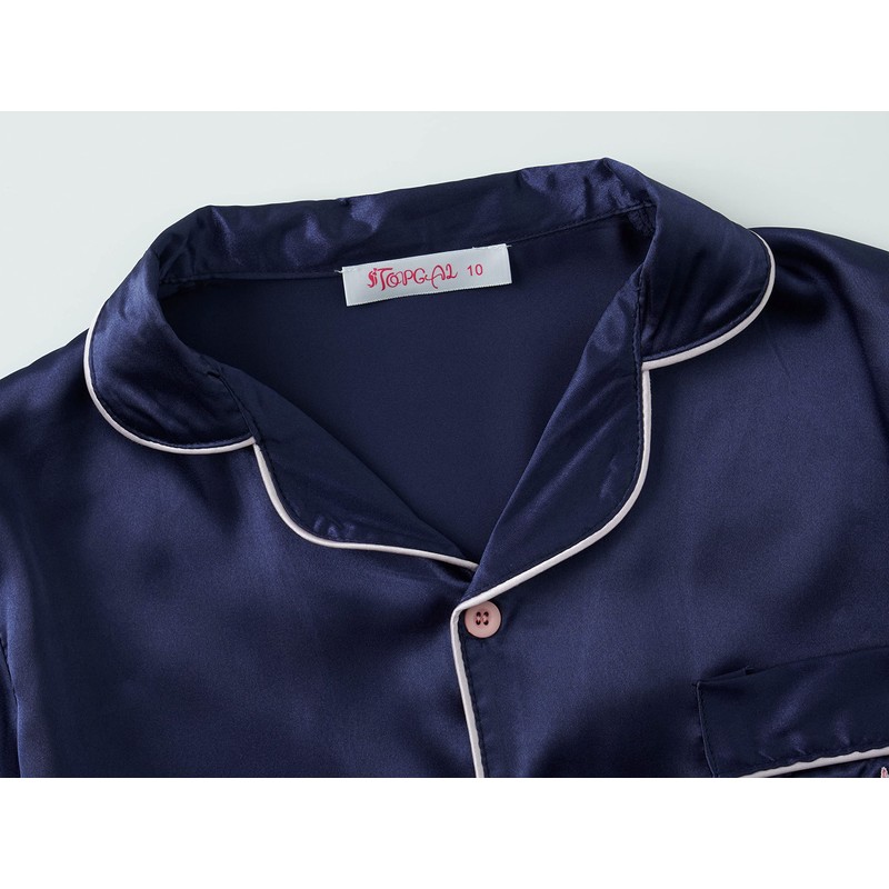Pijamas de satén para niñas estilo abrigo unicornio y gato seda botón abajo conjunto tamaño 6-16, Azul marino/flor y brillo, 14