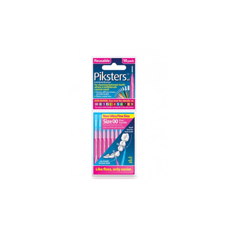 This is a 10 pack of Piksters size 00. Piksters interdental brushes are small cylindrical brushes designed to slide into and clean the spaces between the teeth. Unlike floss, they can engage and remove the plaque from within the small crevices.