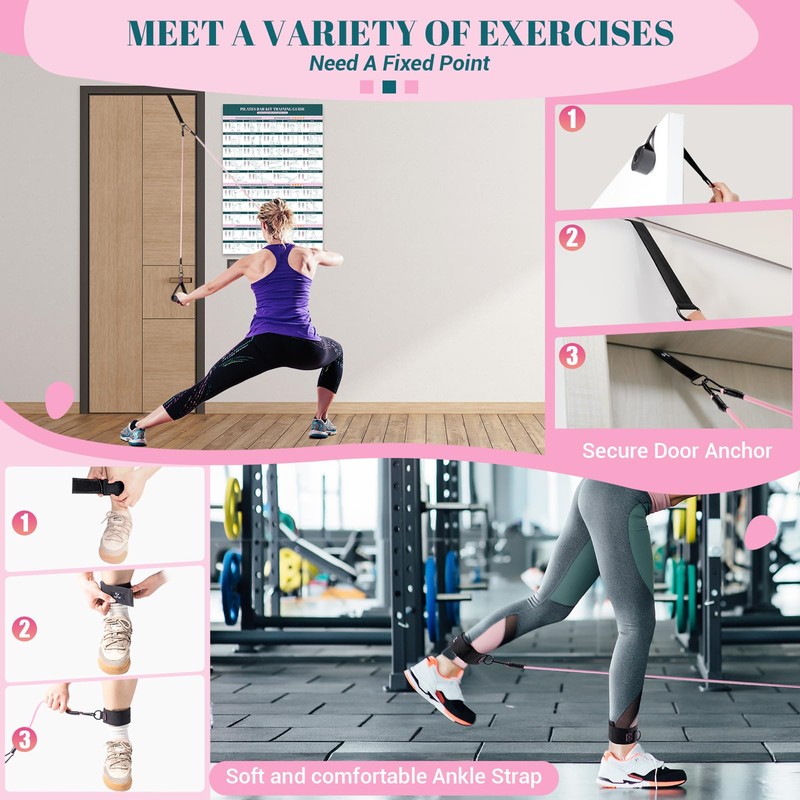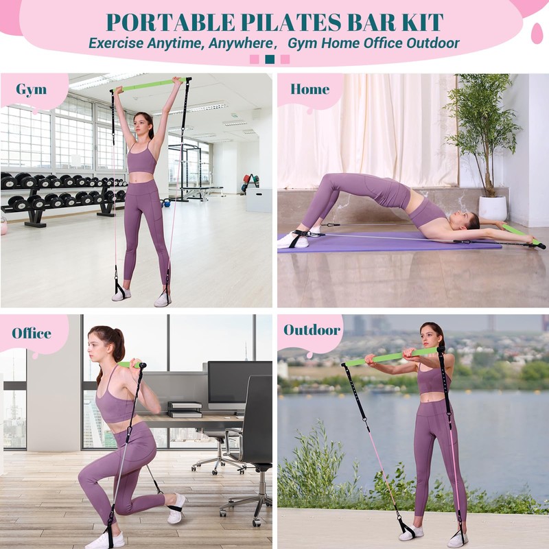 - [Multifunctional Pilates Bar Kit]: Upgraded pilates bar set can be used for yoga, pilates, stretching, fitness and other training programs, exercising your arms, legs, buttocks, waist, neck and back. As long as you use it to do different movements, you can shape and maintain a perfect figure. 20lbs, 25lbs and 30lbs of resistance bands can be combined into 20lbs to 150lbs of resistance to meet the needs of various exercises. Door anchor, handles, and ankle straps enrich your exercise methods.