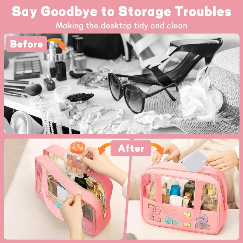 Pilipane Chenille Letter Clear Zipper Flat Pouch, Transparent Waterproof Stuff Cosmetic Bags,Cosmetic Toiletry Storage Bag with Zipper Toiletry Bag with Preppy Patch for Women, Travel, Gym, Beach