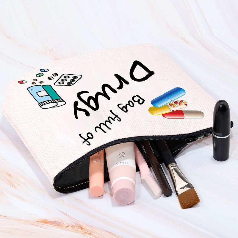 - Print: bag full of medicine toiletry bag makeup case funny travel bags cotton zipper pouch canvas toiletry bag for travel, school, dorms