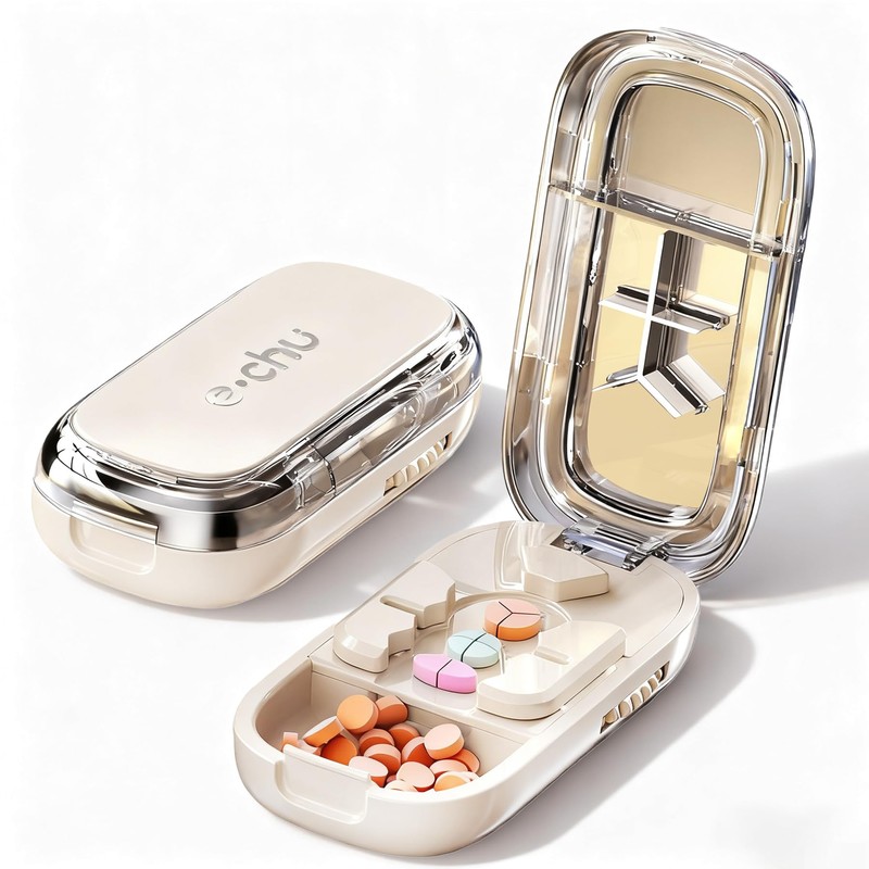+ The compact size of the pill cutter with storage compartments makes it easy to travel with and clean.