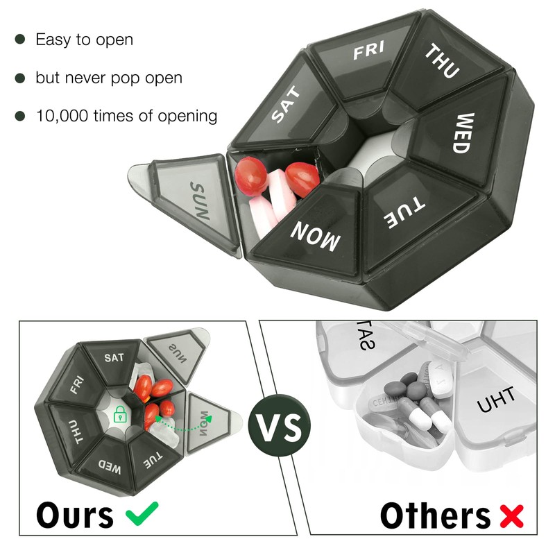 - STYLISH AND PRACTICAL DESIGN: Our pill containers has 7 compartments, each labeled with the day of the week, ensuring convenience and organization. Reinforced switch clips and connecting parts on the base minimize spillage and bending, making it ideal for helping you stay on top of your medication regimen, so it's a great gift idea for dads, gifts for moms, gifts for women, gifts for men. pill box 7 days pill case small birth control pill case pill case for purse weekly pill organizer small