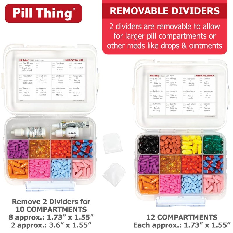 - Great for Travel - Keep all your pills organized and in 1 container and then when you are ready to go just drop in your suitcase, luggage or bag. Product Dimensions C Overall: 8 x 6 x 1.9 Approximate Individual Compartment Size: 1.73 x 1.55 x 1.7 Deep
