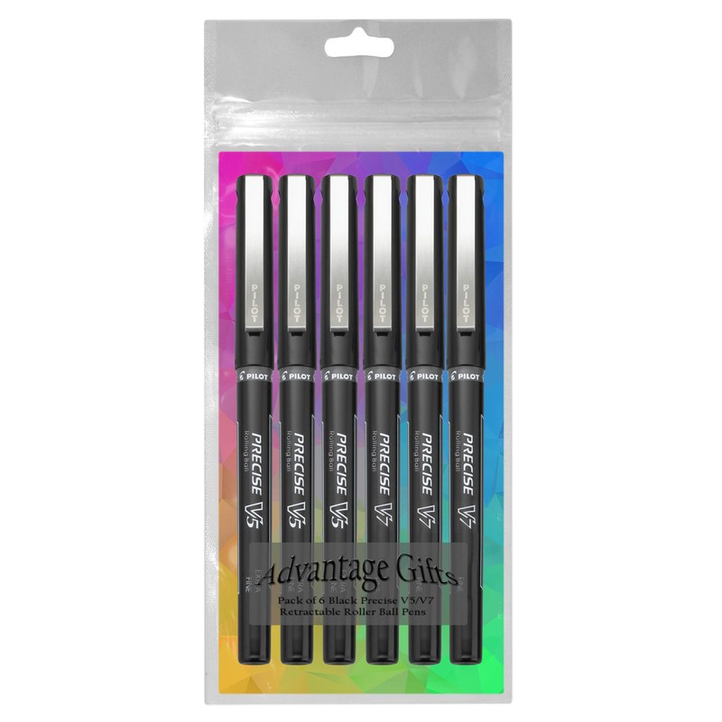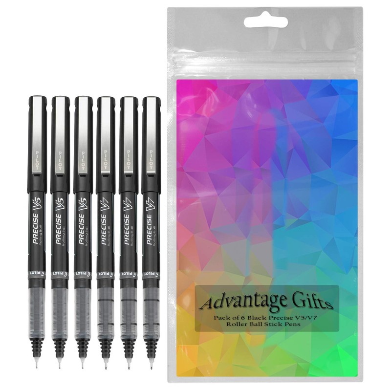 - THIS BUNDLE INCLUDES: These Precise V5 and V7 Stick pens are everyone's favorite! The pack includes 3 V5 and 3 V7 Stick pens, all of them in Black Ink. These are original and authentic Pilot pens. In order to keep them neat and organized, you will be receiving a free plastic pouch for easy storage and great durability by Advantage Gifts. We especially combined the right colors to create this bundle. Be sure to check out our other great pen pouches and mixes.
