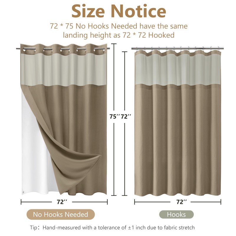 • 【Easy Maintenance】This waffle weave shower curtain is easy to care for – simply machine wash in cold water and hang to dry (laundry bag recommended). Tumble dry on low and low-temperature steam ironing if needed.TPU Lamination Technology liner dries 50% faster than PEVA.Fits standard tubs (72"×75"). Reinforced edge stitching for extended durability.