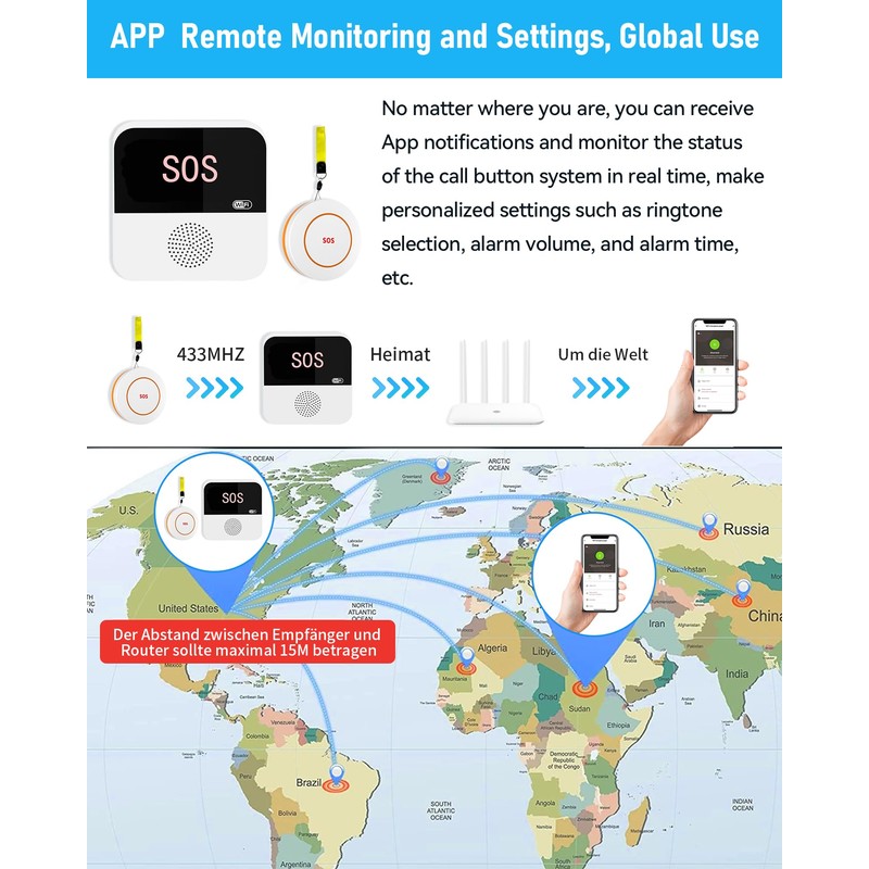 - Smart App Control: Custom Tones, Volume & Real-Time Monitoring. Assign 18 ringtones, adjust 4 volume levels & track battery/signal status in-app. Name devices (e.g., "Bedroom Button") for faster response. No monthly fees—lifetime free updates