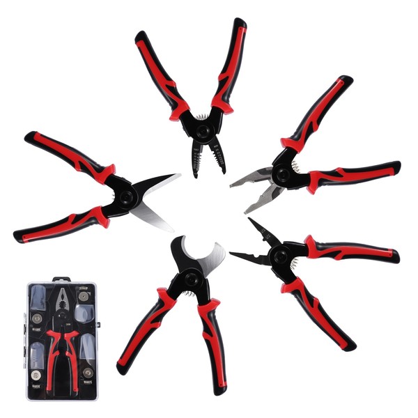 - Interchangeable pliers set: 5-in-1 pliers set has a variety of interchangeable pliers for a variety of tasks. There are crimping pliers, wire strippers, wire cutters, cable cutters, scissors