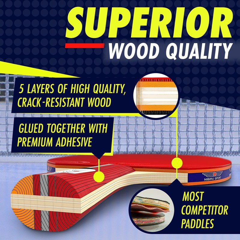 - Quality Wood: Each table tennis racket consists of 5 layers of high-quality crack-resistant wood handles that safely will not splinter. The flared handle smoothly fits most palms, allows great grip and is sweatproof to keep your hands clean.