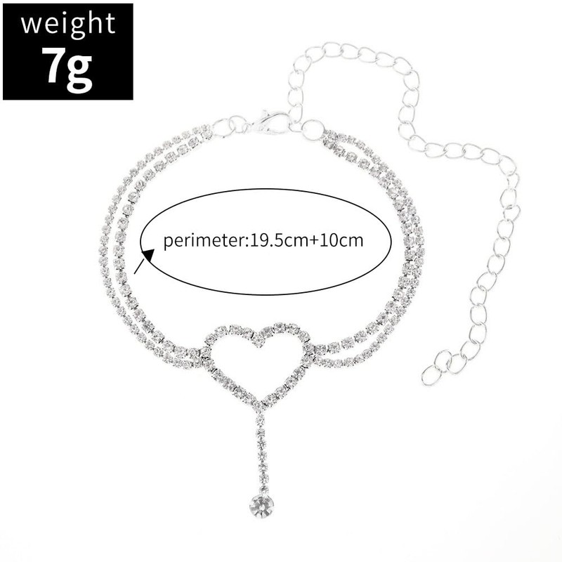 Pingyongchang - Pulseras de tobillo con diamantes de imitación de corazón para mujer, tobilleras ajustables plateadas brillantes y plateadas, elásticos, con circonitas cúbicas y diamantes, Diamante de imitación, Sin gemas.