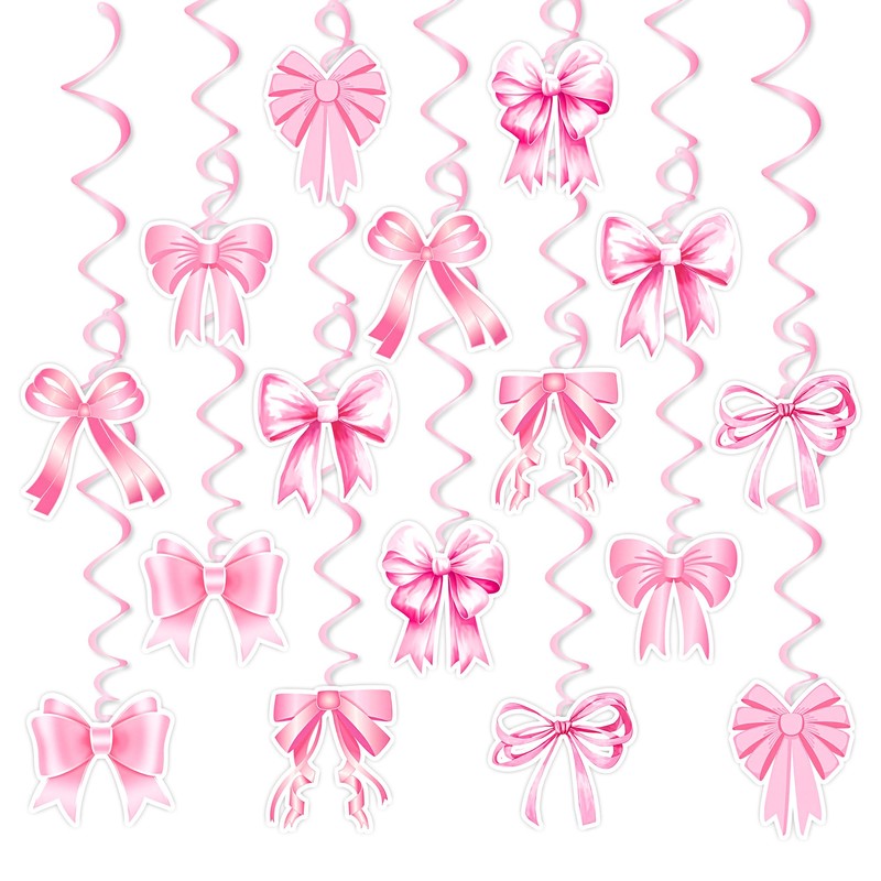 - 32 Pcs Pink Bow Decorations: The product includes 16 pink bows, 16 single spirals, and a sufficient number of connecting hooks, allowing you to casually decorate the bow party scene to your liking. 8 different styles of bow designs add more romantic atmosphere to your party