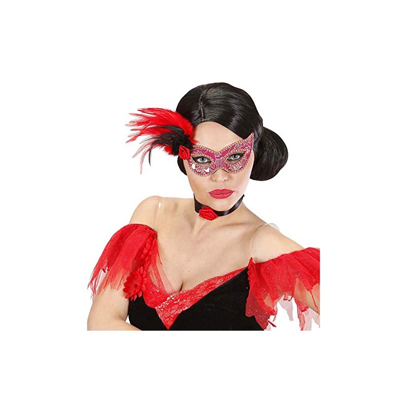 • It is decorated with a red rose and feathers. The mask itself has the colour pink and is decorated with a golden ribbon