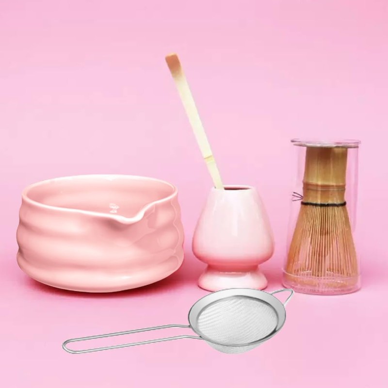 Pink Matcha Whisk Set of 5 for Matcha Tea,Matcha Starter Kit(Bowl with Spout+Bamboo Whisk and Holder+Strainer+Scoop) for Macha Beginner Making Tools with Small Sifter Sieve Mixer Wisk Chasen Chawan