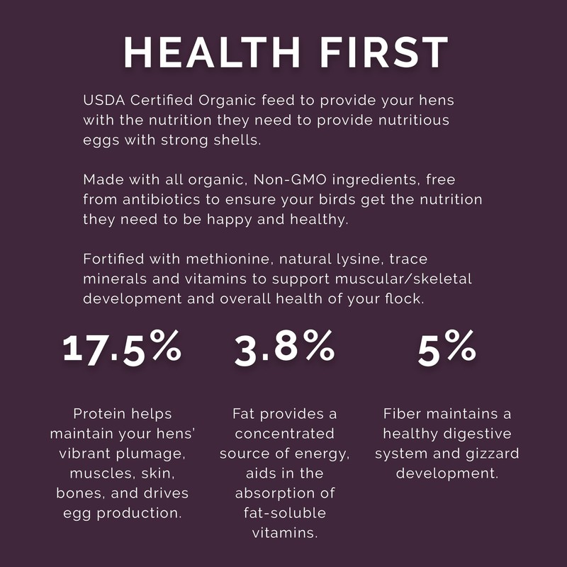- Feeding Organic Means Feed Safety: USDA organic certification requires no drugs, antibiotics or other contaminates, at any point. From the soil to you, and every step along the way, this is our USDA organic guarantee.