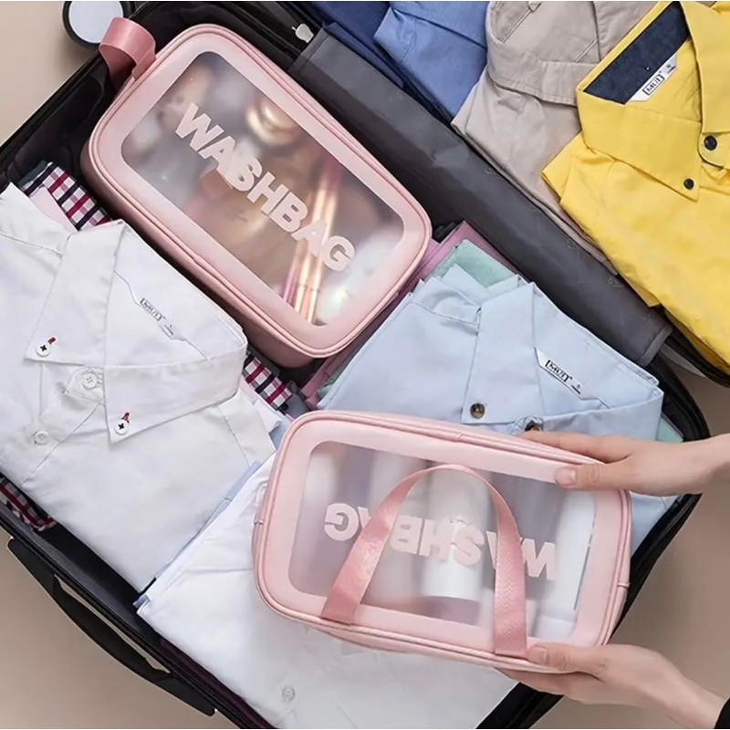 Pink Transparent PVC Cosmetic Bag 3pcs, Waterproof, 3 Sizes, for Travel and Daily Use