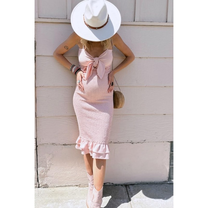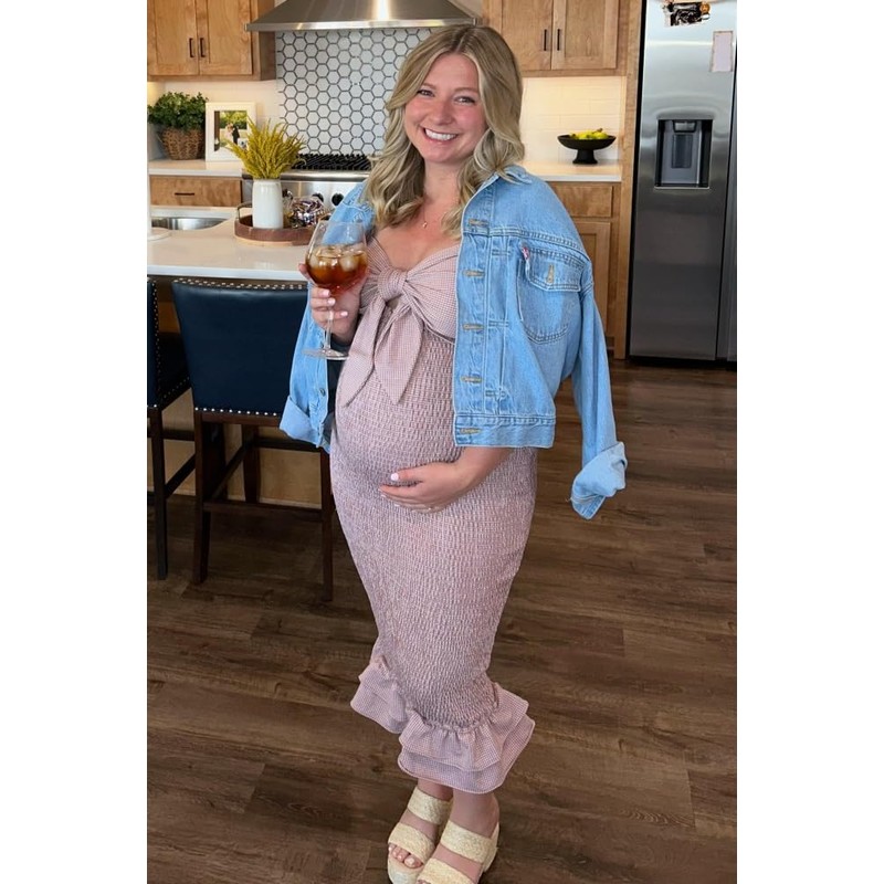 - A gingham print smocked fitted maternity midi dress featuring a self-tie bust, adjustable cami straps and a ruffle hem.