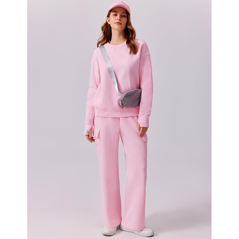 PINSPARK Womens Sweatsuits 2 Piece Set 2024 Fall Fashion Oversized Lounge Sets Fleece Crewneck Sweatshirts Wide Leg Cargo Sweatpants with Pockets Cozy Tracksuits Loose Travel Outfits, Pink Medium