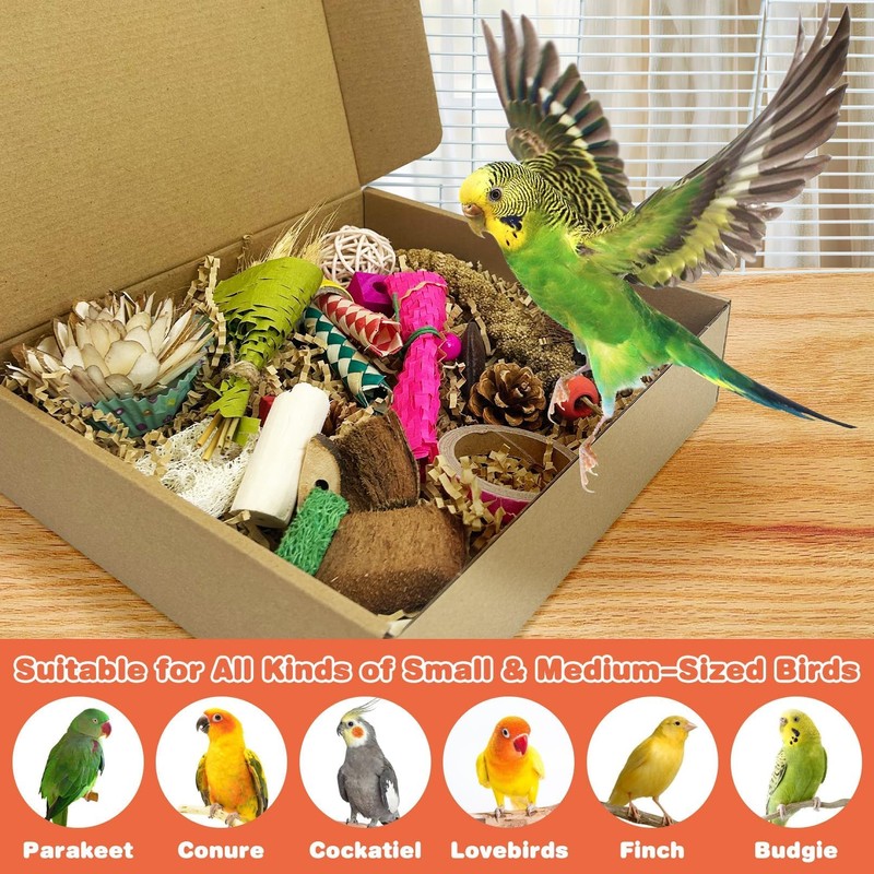 Suitable for cockatiels, conures, budgies, and lovebirds, these natural bird toys promote foraging behavior, mimicking the birds' instinctual activities. Each toy in this variety box is crafted to encourage chewing and shredding, which helps in reducing stress and improving overall health.