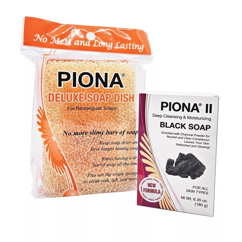 PIONA ll Deep Cleansing & Moisturizing Black Soap 6.35 Oz. and Deluxe Soap Dish