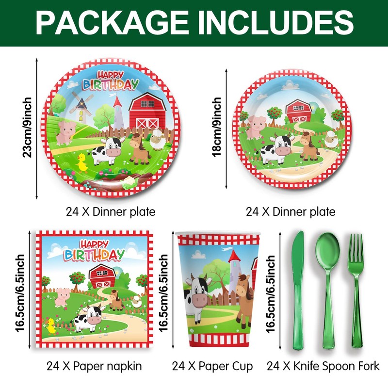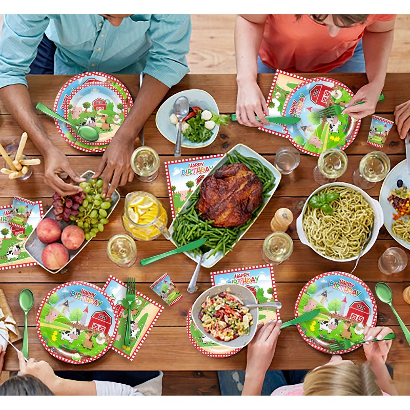 - Vajilla de fiesta de animales de corral: este juego de vajilla de cumpleaños con temática de Farm House incluye 24 platos de papel de cena de 9 pulgadas, 24 platos de papel de postre de 7 pulgadas, 24 servilletas, 24 tazas, 24 tenedores, 24 cucharas, 24 cuchillos, para suministros de fiesta de cumpleaños de animales de corral