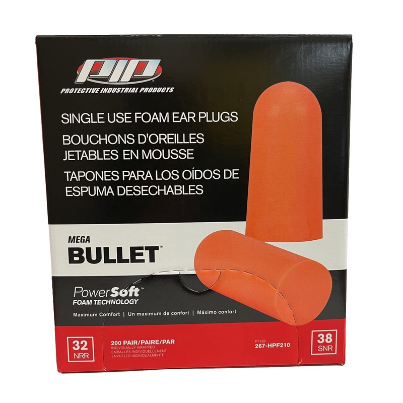 PIP Mega Bullet Disposable Soft Polyurethane Foam Ear Plugs, Uncorded - NRR 32 - 200 Pair/Box