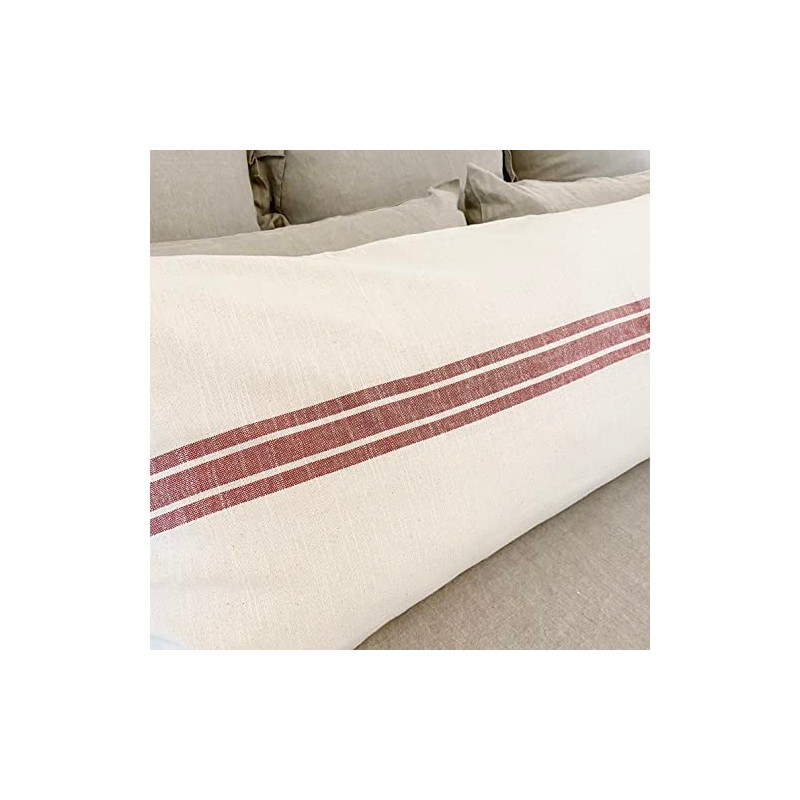 - A trio of 3-grain sack stripes in muted red run horizontally across the natural cream toned pillow cover. Long body pillow sham reverses to the same fabric design on the back and a 3.0" overlap of fabric at the opening offers a stable place to secure 2 natural-toned wooden buttons (1”). One extra wooden button is inside the cover, just in case!