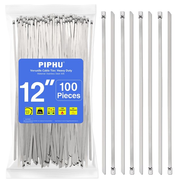 PIPHU 12 Inch Metal Zip Ties (100 Pk) 304 Stainless Steel Cable Ties Heavy Duty Zip Ties 270 lbs Suitable for Exhaust Wrapping Fence Outdoor Canopy