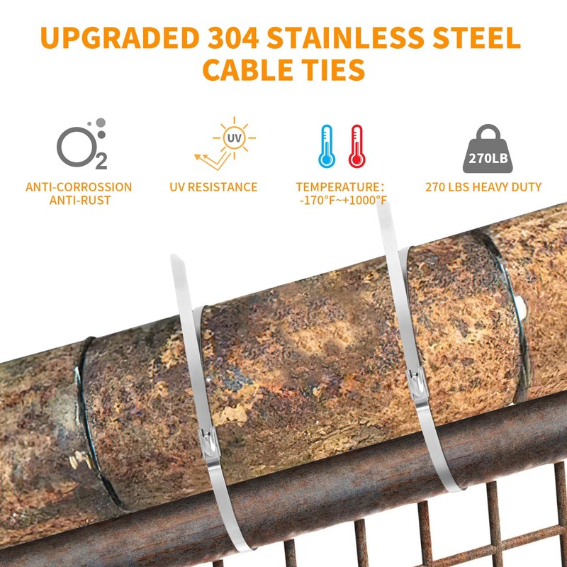- 304 Stainless Steel: Made of high-quality 304 stainless steel, these metal zip ties are highly resistant to rust, corrosion, and weathering, ensuring durability and longevity in outdoor environments.
