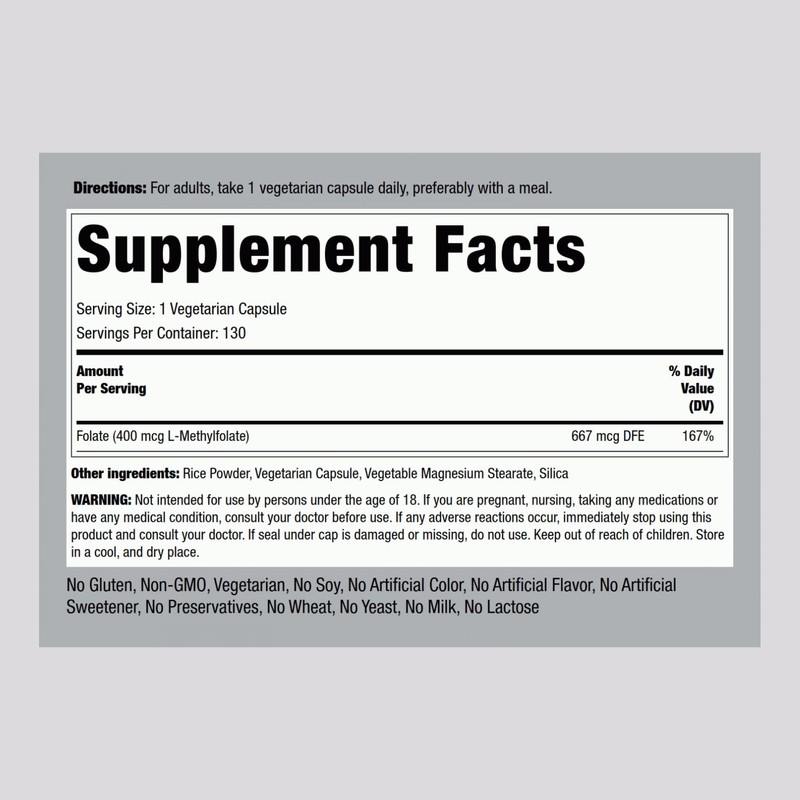 Our advanced formula features 400 mcg L-Methylfolate, 167% of your recommended daily value, in vegetarian capsules. Our 200 capsule supply is gluten free and non-GMO, plus it's made with no artificial flavor, sweetener, or preservatives, making it a top supplement of choice for men and women everywhere!