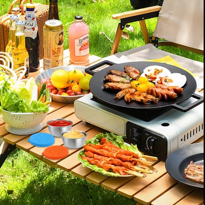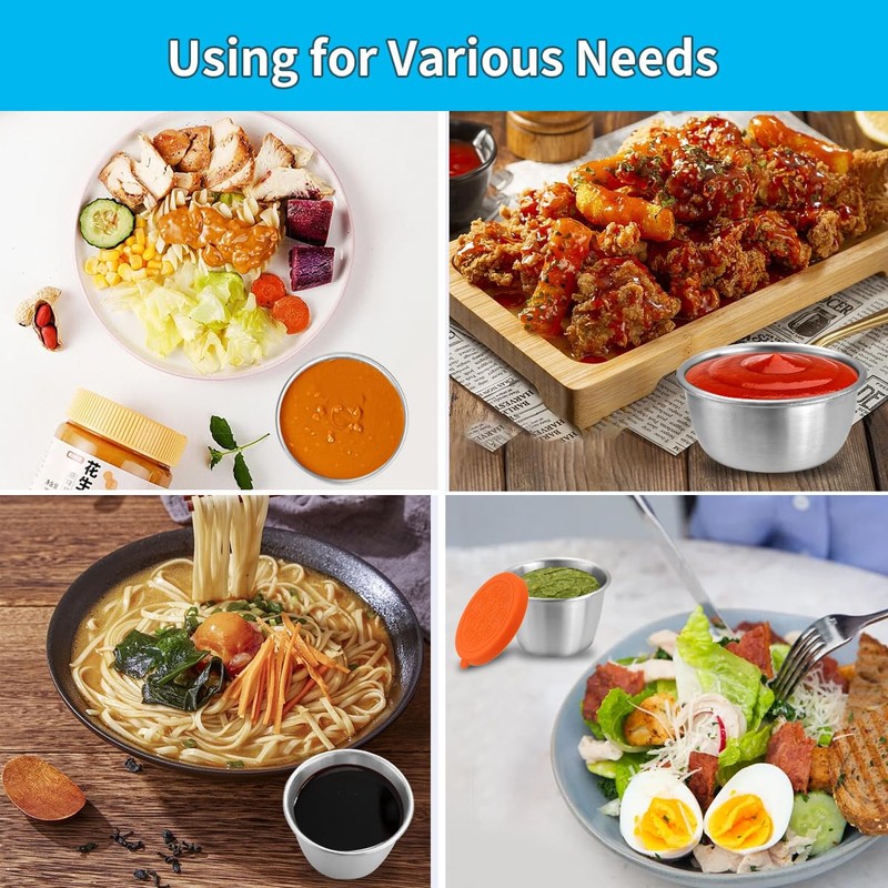 • The size of the 1.7 oz stainless steel dip sauce cup is 5.4 cm / 2.13 inches (diameter) and 2 .8 cm / 1.1 inches (high), which is very convenient to carry on the go. The 6-piece set can meet your requirements for small capacity and variety. Perfect for school or work lunches, picnics, BBQs, parties, travel, etc.