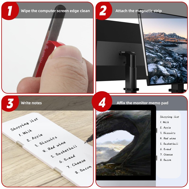 - [Monitor Memo Board] Introducing our innovative Monitor Memo Board, a magnetic dry-erase whiteboard that's the ideal companion for your computer screen. Keep your tasks, notes, and reminders right where you need them, enhancing your productivity.