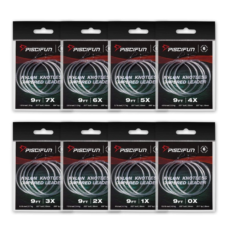 Piscifun Fly Fishing Leader with Pre-Tied Loop, Tapered Fly Line Leader, Nylon, Clear, 9ft, 6 Pack, 3X