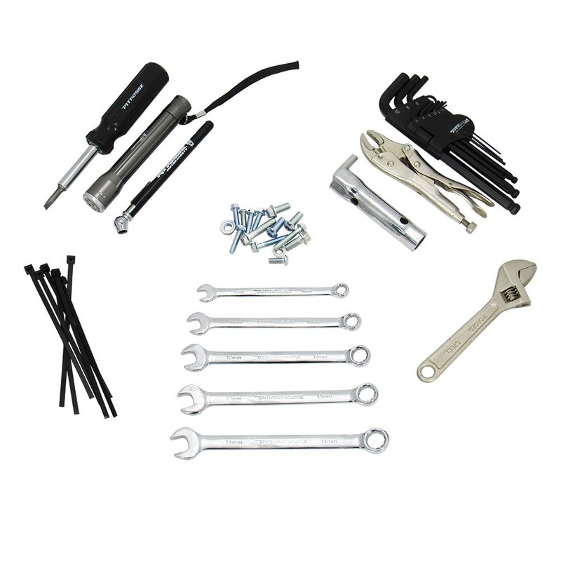 - ✅ COMPACT COMPREHENSIVE TOOL KIT YOU MUST HAVE- Pit Posse’s tool kit consists of 8, 10, 12, 13, 14mm wrenches, adjustable wrench, 6-in-1 screwdriver, 9pc. Metric hex set, 2-in-1 spark plug socket, locking pliers, led flashlight, zip ties, air pressure gauge, assortment metric bolts. This tool set is the perfect add-on to the factory tool kit and has everything you might need.