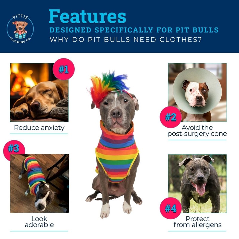 Welcome to the Pit Bull Club! -- Introducing our exclusive collection of pit bull muscle t-shirt for dogs. We 100% understand the unique needs of pitbulls. We have designed our t shirts to cater to dogs with larger chests and necks, while also ensuring a shorter body length for a perfect fit. Say goodbye to ill-fitting clothes and hello to superior comfort with our specially designed pit bull cooling muscle tees. Receive (1) Muscle Tee . Matching sets sold separately. **Please read size chart carefully** Adora-bull -- Not only do our pit bull t shirt vest prioritize comfort, but they also exude style and personality. We believe that your pitbull should showcase their individuality even while lounging around at home. That's why we offer a range of adorable and trendy designs to choose from. Whether it's cute prints, funny or fun prints or vibrant patterns, our dog cooling shirt allow your pitbull to stand out in the cutest way possible. The best pitbull accessories for dogs. Our large size high neck t shirts offer versatile uses that go beyond just a fun dog outfit -- They serve multiple purposes such as aiding in post-surgery recovery, providing relief for itchy skin, preventing short-term scratching, offering protection during the summer months, helping to reduce anxiety, and even working towards reducing breed stigma. These dog t shirt for pit bulls will make your dog feel good because they will look good! Treat your pitbull to the ultimate level of comfort with our cozy and stylish pet t shirts. Our dog shirts for large breed are stretchy, lightweight material, neck can be worn high or folded, and even have a high cut tummy for potty time. Our pitbull dog sun protection shirt is specifically made to tailor pitbull outfit dogs only.