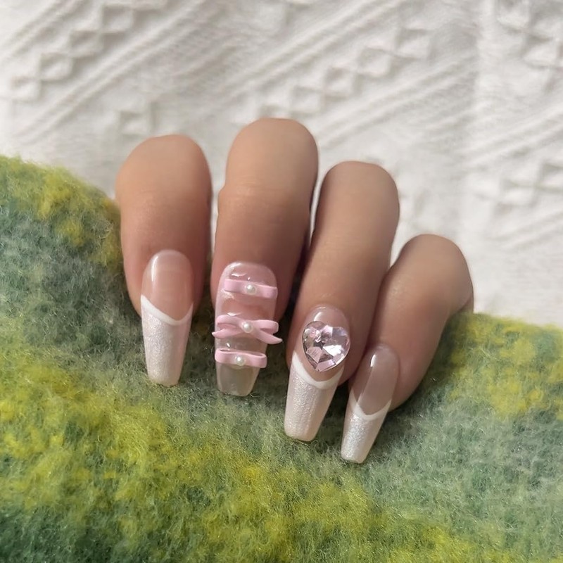 PIVHWIR Press On Nails,15 PCS Reusable Glitter Long Fake Nails, 3D Bow Design Press On Nails, Stick On Nails,Rhinestone Fake Nails-Pink (S)