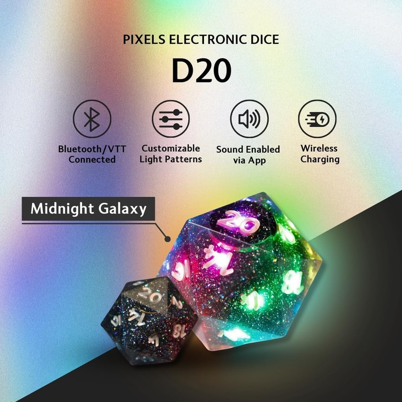 Pixels Electronic Dice - D20 (Midnight Galaxy) - RGB Polyhedral Dice, App-Controlled Light Patterns & Audio, Wireless Charging, Resin, VTT Connectable via Bluetooth, for Role Playing Games Like DND!