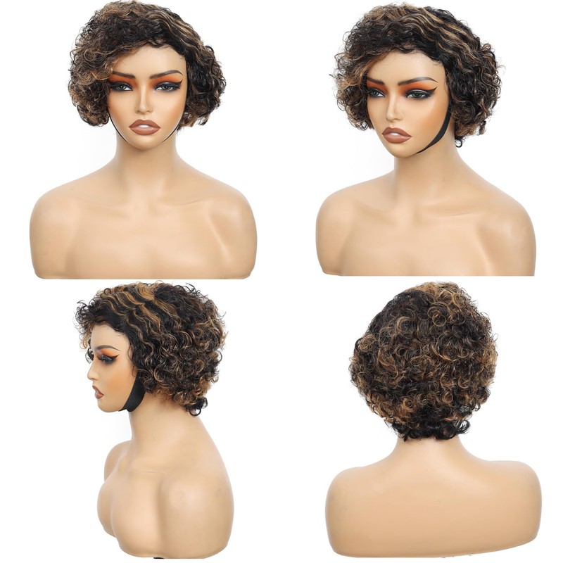Pixie Cut Wig Human Hair Black and Brown Highlight Wig Human Hair curly short curly wigs for black women P1B/30 afro kinky curly wigs glueless wear and go Curly Bob Wigs With Bangs (F1b30, 8 Inch)