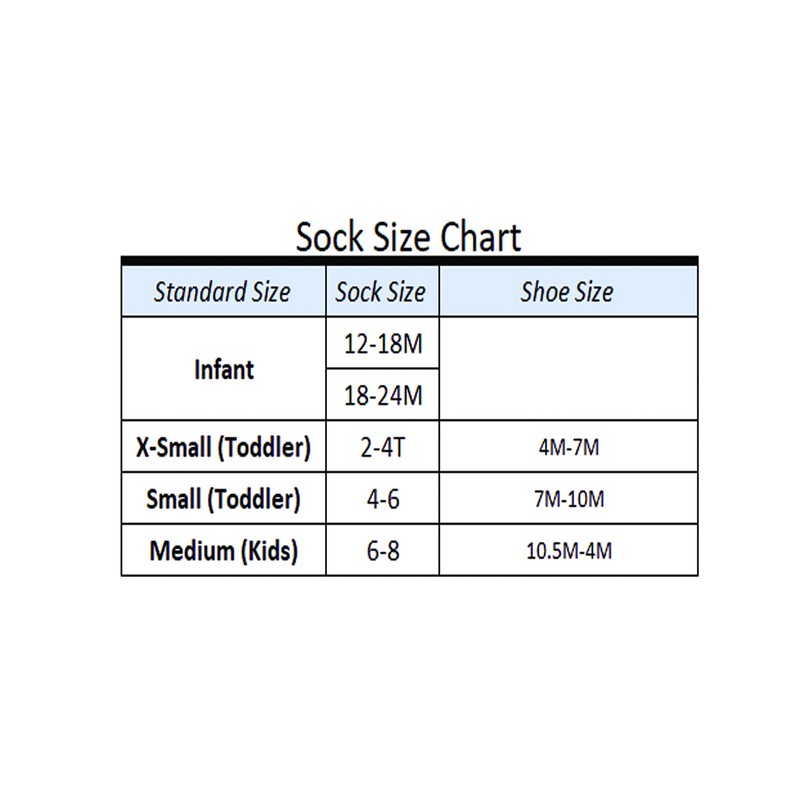 - These socks come in size X-Small, which fits shoe size 4M - 7M US Toddler, Small, which fits shoe size 7M - 10M US Toddler, and Medium, which fits shoe size 10.5M-4M US Kids.