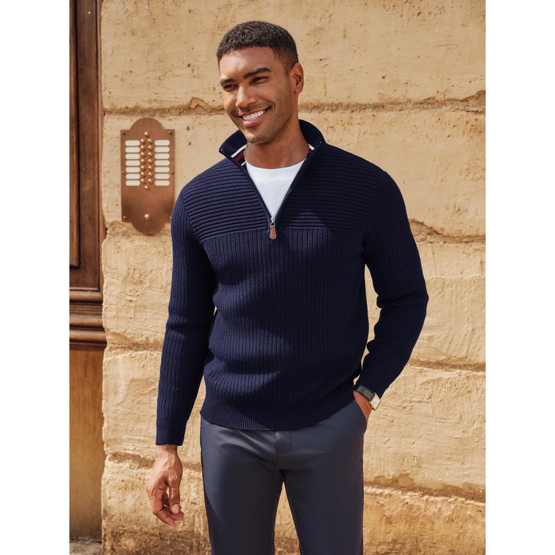- Design - Discover our long-sleeved 1/4 zip jumper for men - a timeless design that impresses with its modern texture and classic V-neck.