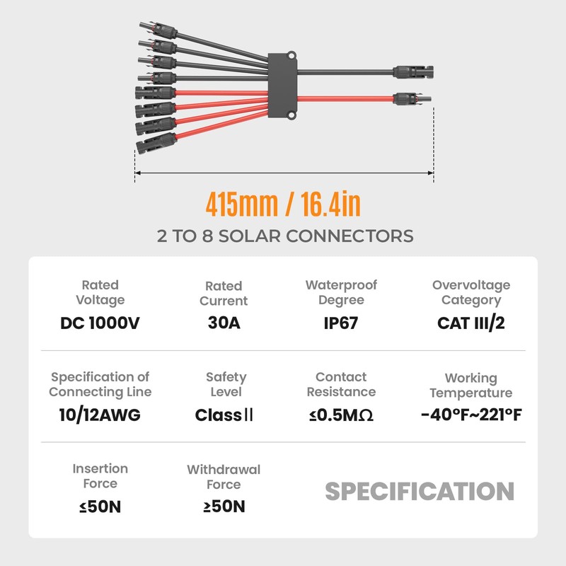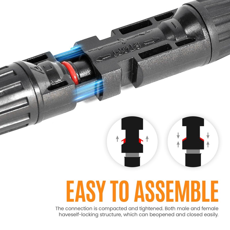 - Safety-Certified & Zero-Risk Warranty: Rigorously tested to meet TÜV/IEC/SUD standards, solar parallel connectors eliminate fire risks from loose contacts. Just press the two sides of the built-in lock on the male connector with your fingers to easily connect and disconnect, and it is not easy to fall off. 3000 plug and pull tests
