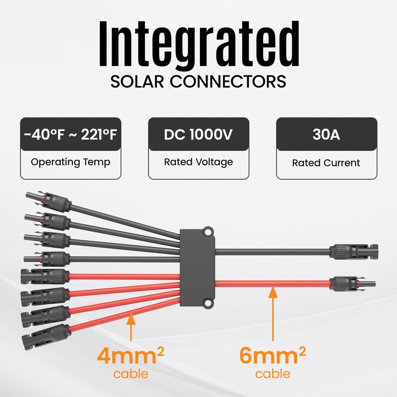 - Universal Compatibility & Intuitive Color-Coding: Compatible with TS4, and most industry-standard connectors (excluding Amphenol), solar parallel connector red (positive) and black (negative) cables simplify DIY setups. Designed for 10AWG-14AWG solar wires and rated for DC1000V/30A, they adapt seamlessly to residential, RV, and off-grid systems