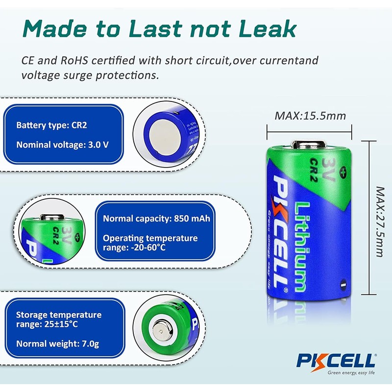 • Type: CR2 lithium battery; Voltage: 3V; Capacity: 850mAh; Longer Shelf Life: 10 years. Warm tips: It is Non-rechargeable
