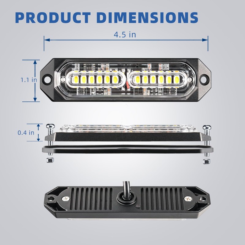 - EASY INSTALLATION - Automotive emergency strobe lights with Ultra-thin design is very easy to install. Supplied with gaskets and screws to mount it to the grille or bumper .The Package coming with installation manuals.