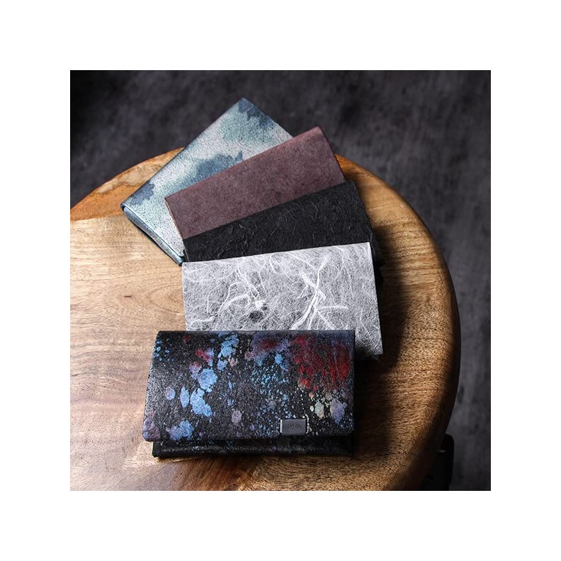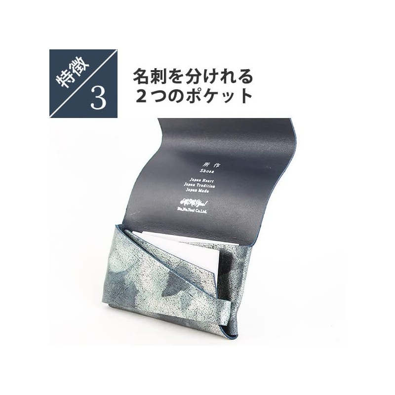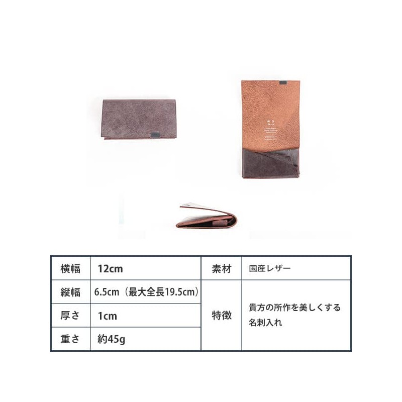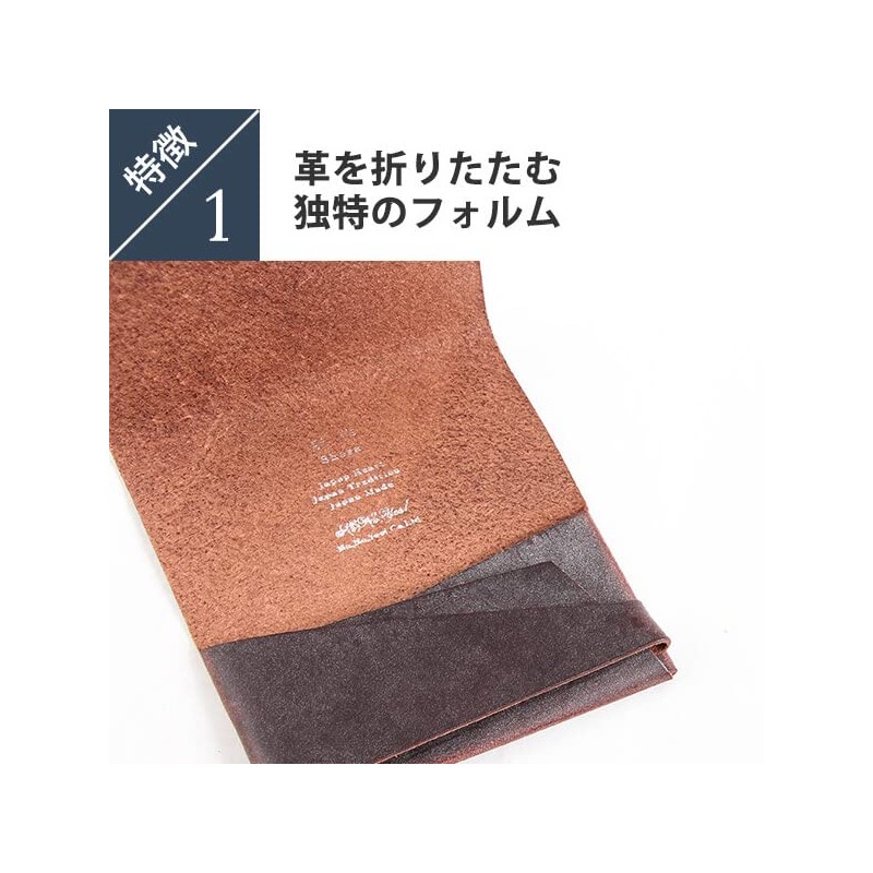 A stylish and creative business card holder made of domestic leather. The image of “Kiso (Fukusa)” wrapping the celebration, and is an item that shapes the traditional beauty of Japan. It is made of a single piece of leather that is folded together like origami paper so there is no seams. It is fastened with a single screw like used in theme parks. It reduces the burden on the leather, and uses durable hardware, so you can use it for years to come. Bridle leather and leather with a Japanese paper pasted together, you can feel the unique atmosphere of this business card holder. Minimizes color retention to enhance the natural texture. Therefore, if it gets wet with sweat or rain, it may fade or change color. In that case, dry with a dry cloth and let it air dry in the shade. Please note that there may be a chance of color transfer due to strong friction. It weighs approximately 2.5 oz (70 g), and is divided into two pockets, so you can sort business cards. Because of the natural leather, the lid may float slightly at first, but when you use it, the leather will become soft and soft so you can fix the lid firmly. The seamless design keeps it thin and easy to put in your jacket pocket.
