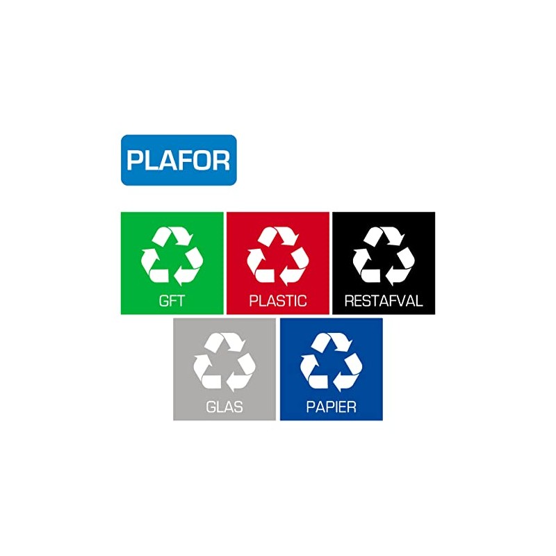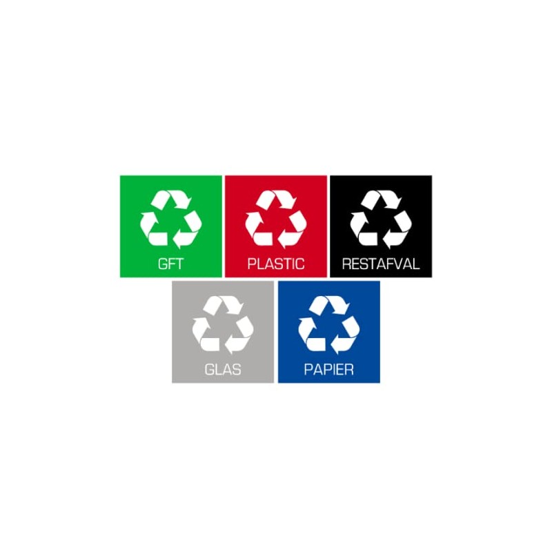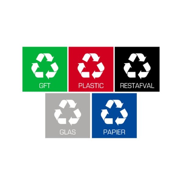 Mit den 5 Recyling Aufklebern können Sie angeben, wofür der Behälter bestimmt ist. Jede Farbe steht für eine bestimmte Abfallart. Grün steht für Biomüll, Rot für Kunststoff, Blau für Papier, Schwarz für Restmüll und Grau für Glas.