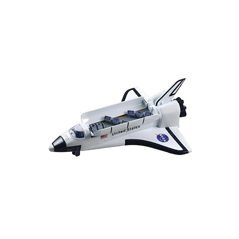 This is a detailed die-cast model of a nasa space shuttle. It features opening roof and pull back action.