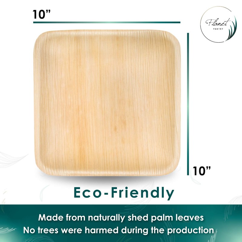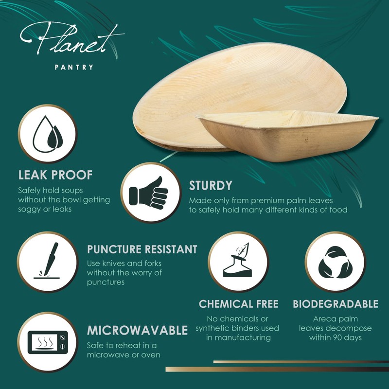 - 🌍100% NATURAL & SUSTAINABLE: Made from naturally fallen leaves of the Areca Palm tree, our disposable plates & bowls are compostable and biodegradable, unlike plastic. Planet Pantry Palm leave plates are free from chemicals or added toxins throughout the process, they are thoroughly cleaned and pressed at 194 degrees Fahrenheit. Perfect for any eco-conscious party, wedding, camping trip, or outdoor event.