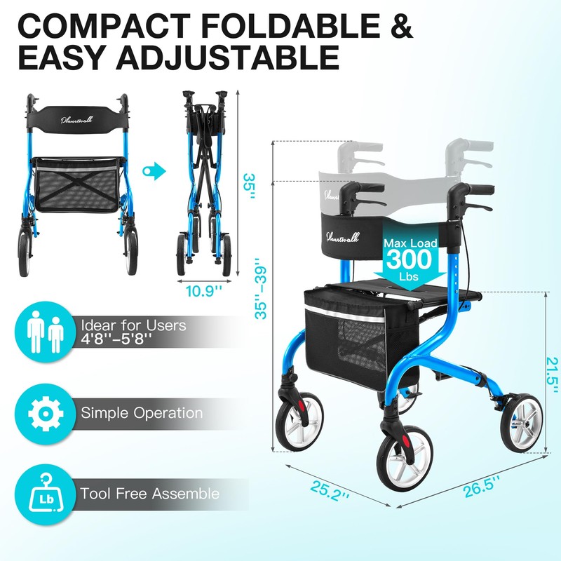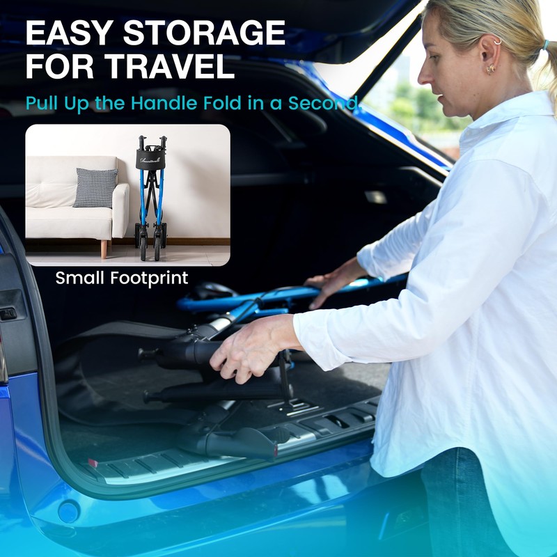 PLANET WALK Super Lightweight Rollator Walker for Seniors, Foldable Rolling Walker with Seat and 8" Rubber Wheels for All Terrain, Unique Design Aluminium Frame Sturdy Walkers for Traveling - Blue