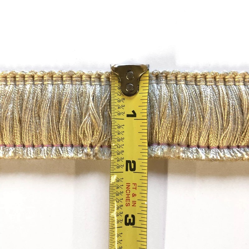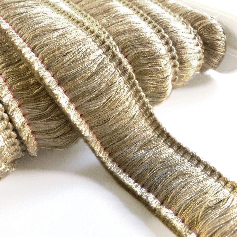 Decorative brush fringe trim in beige and gold.