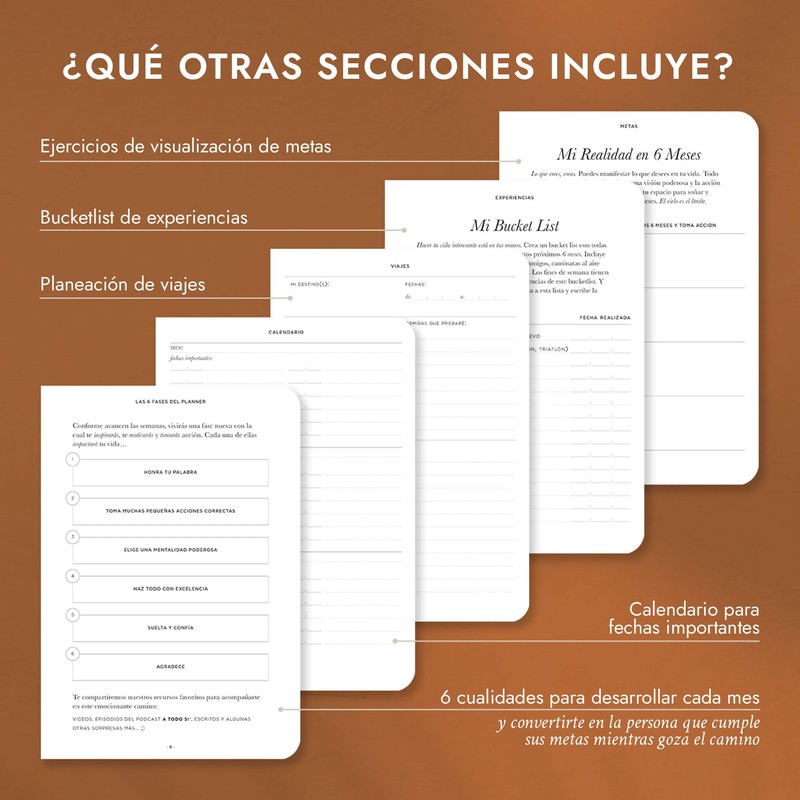 - -156 páginas de planeación (6 meses de páginas no fechadas) -1 tema de desarrollo personal para aplicar cada mes -Video de instrucciones, mini episodios de temáticas del planner, recomendaciones de libros, Ted Talks, episodios de A TODO SI y escritos inspiradores -Ejercicios de visualización de metas -Bucketlist de experiencias -Calendario semestral -Habit tracker semanal -Preguntas para reflexionar semanales -Sección para planeación de viajes